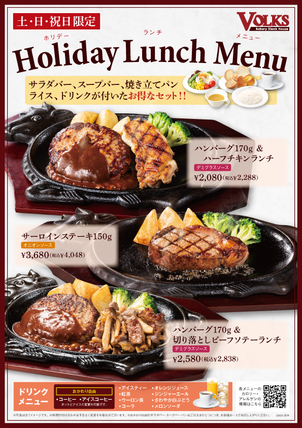 土日祝限定のランチメニュー サラダバー・スープバー・焼き立てパン・ライス・ドリンク付 ※新橋店では焼き立てパンをご提供しておりません。 ※掲載メニューは予告なく変更する場合があります。